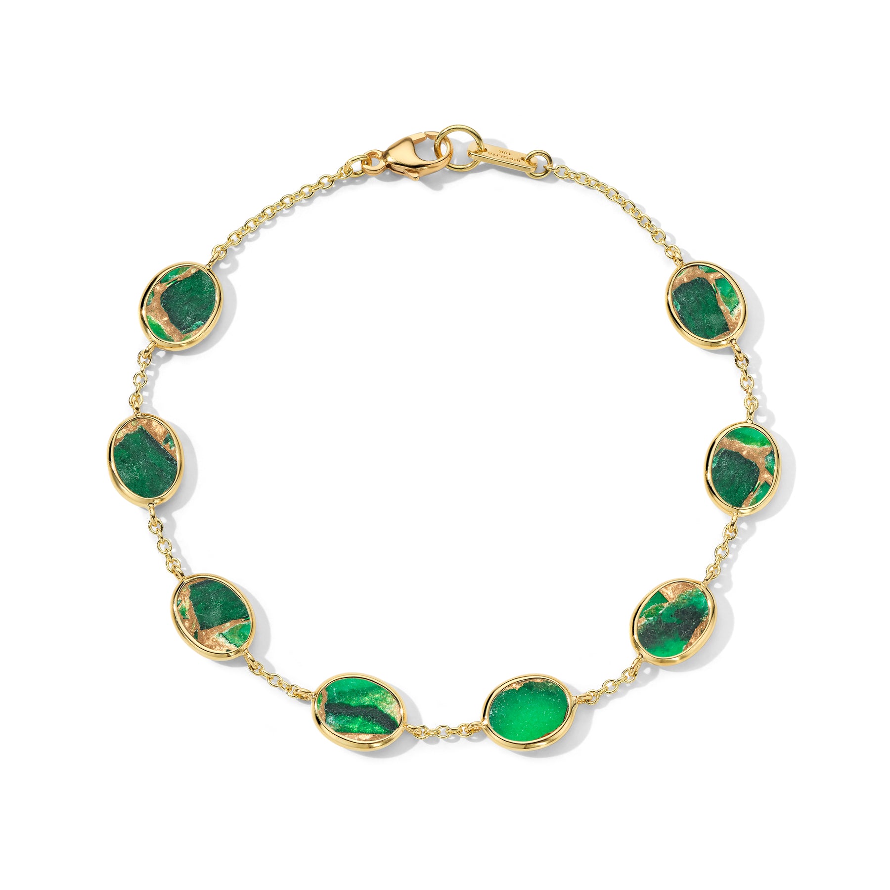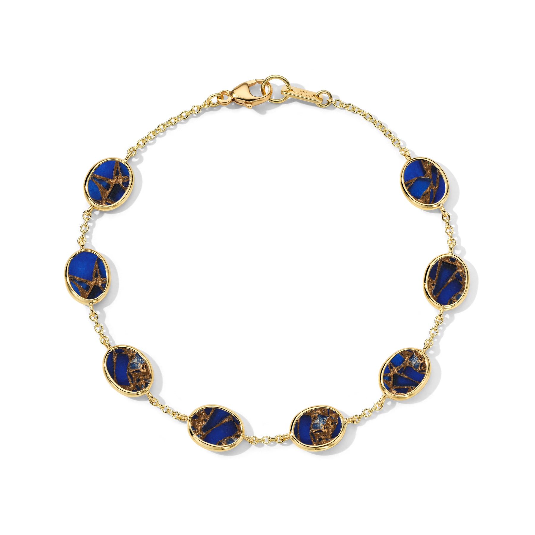 Refined and radiant, this 18K Gold chain bracelet features a stunning sequence of bronze-dyed blue quartz ovals, each framed in gold and artfully arranged along a delicate chain. The deep sapphire hues and natural bronze veining create a mosaic-like effect—striking yet timeless. • 18K Gold • Gemstones: Bronze-Dyed Blue Quartz • Length: 7.25"