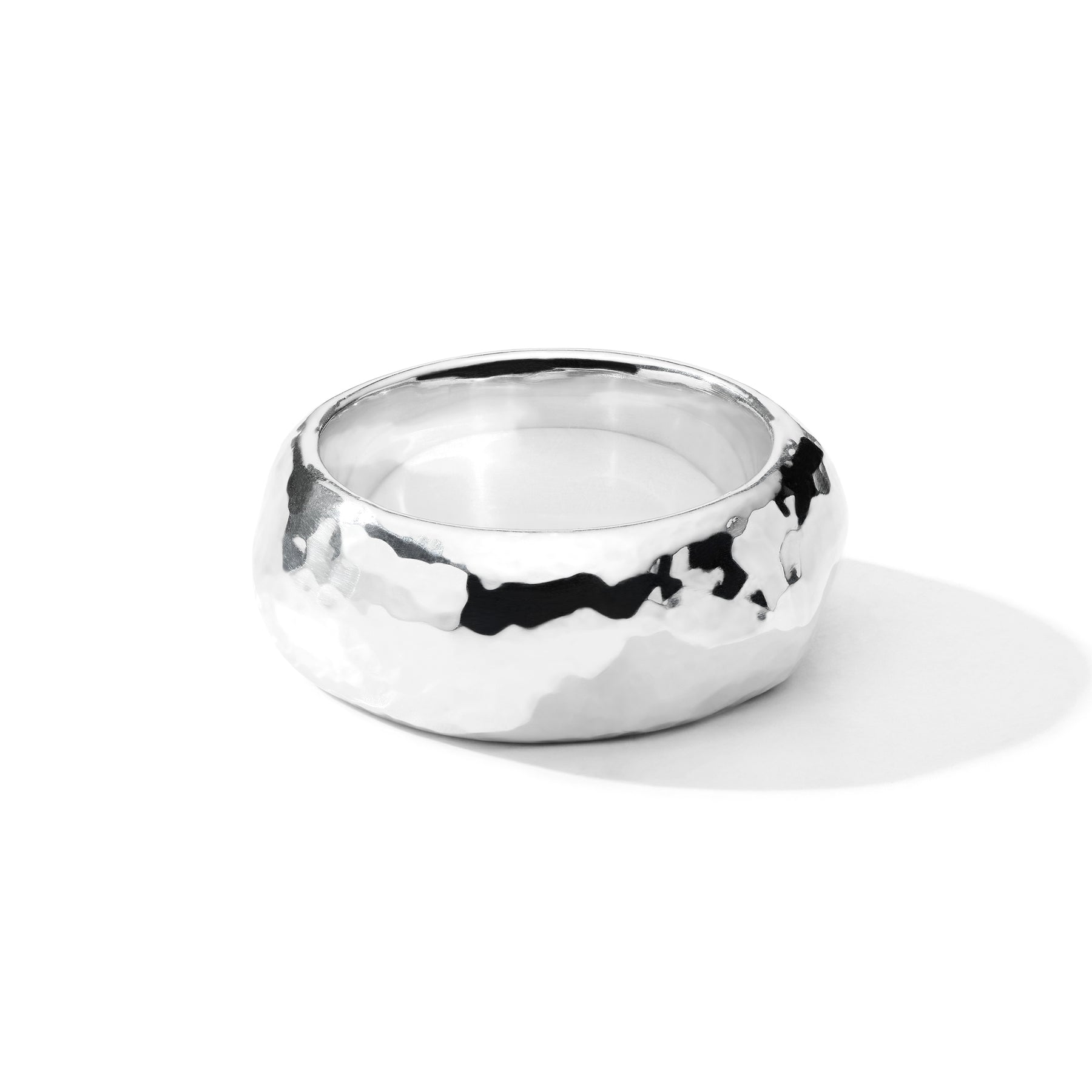 Handcrafted from 925 silver, this ring is shaped into a wide, minimal band, lightly hammered and polished to add eye-catching shine. A modern aesthetic is perfectly captured by the simplicity of its silhouette — wear it solo or paired with stacked bands across the fingers.