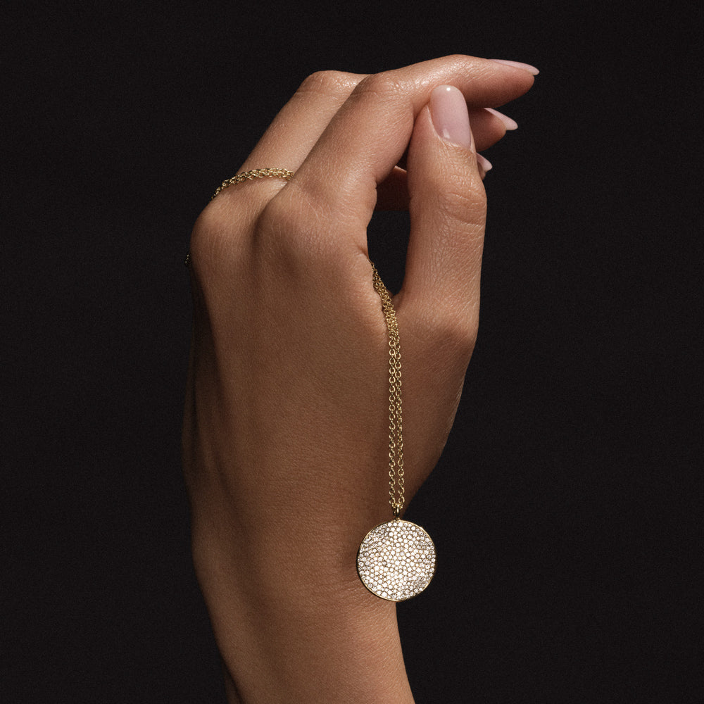 One of the first shapes that Ippolita ever designed, the large pendant that adorns this necklace is cast in 18K gold from a hand-sculpted wax model that features a gently modulated profile. The precious metal is encrusted with dazzling mini diamonds (1.06ctw) that are individually set by hand to cover its entire surface, reflecting the light from any angle.
