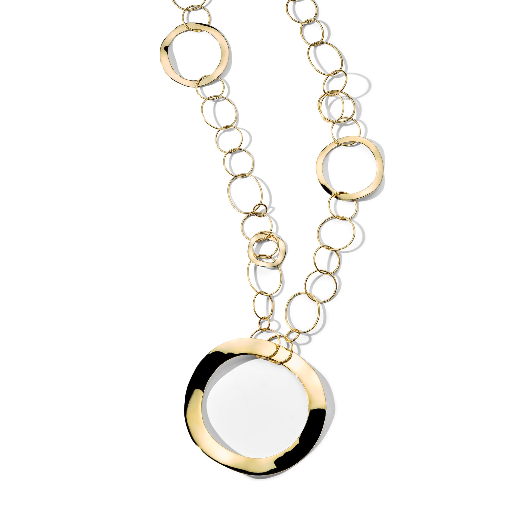 A rhythm of forms defines this long Classico necklace. It’s composed entirely of 18K gold links — ultra-slim wire ovals alternated with undulating open discs. Try uniting it with a chain that’s just as long, then adjusting the styling by doubling or triple-wrapping it to create a layered effect.