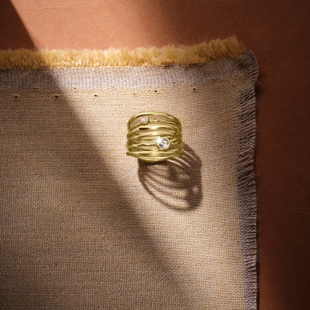 Six bands of wax were hand sculpted by the designer herself and cast in 18K gold, then assembled to create this ring. With the artfully random placement of diamonds, it lives up to its Movie Star name, while its organic shape makes it so easy to wear.