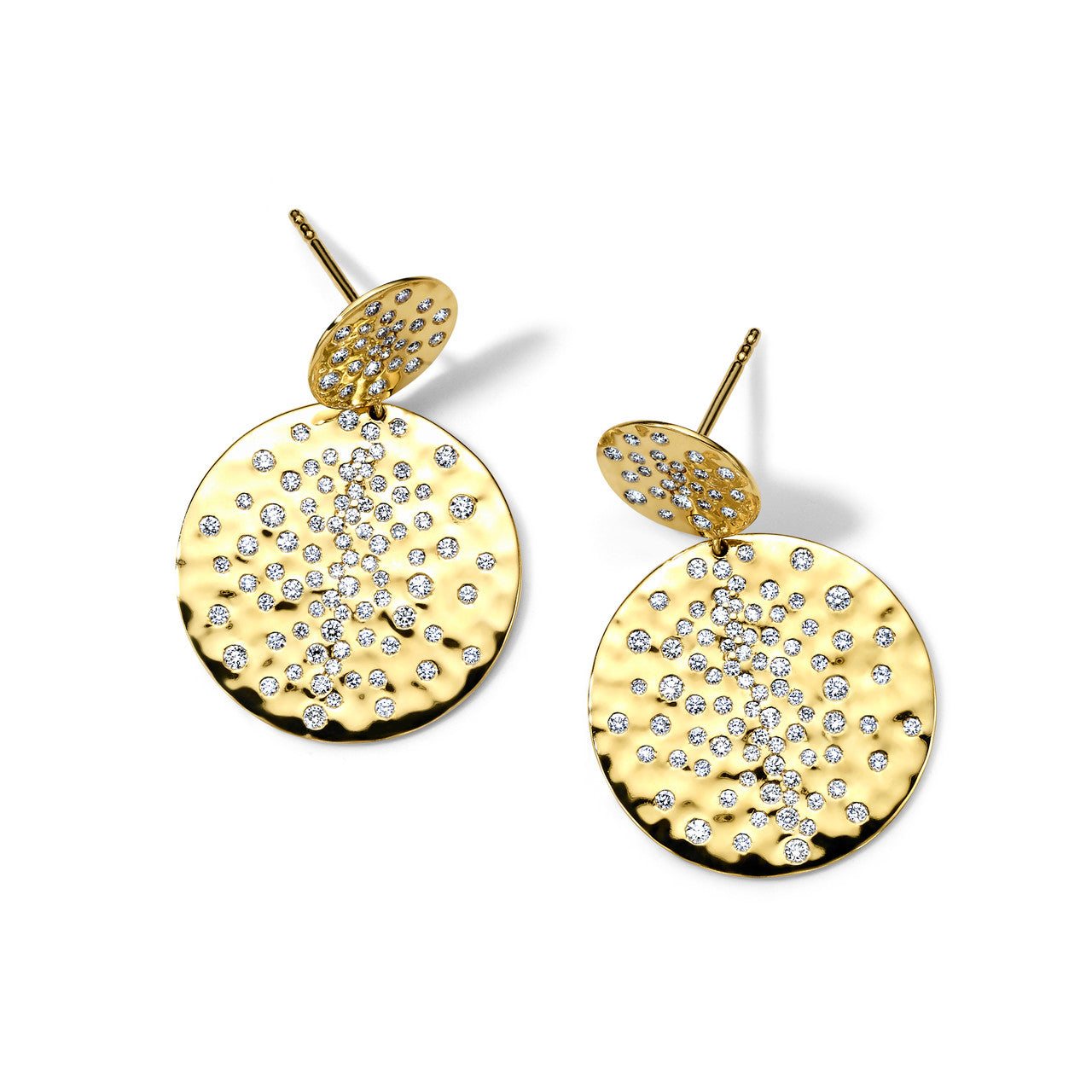 A timeless pair of double-drop earrings to wear all day and on any occasion, these are crafted in 18K gold, lightly hammered by hand, and sprayed with .87 ctw of diamonds.