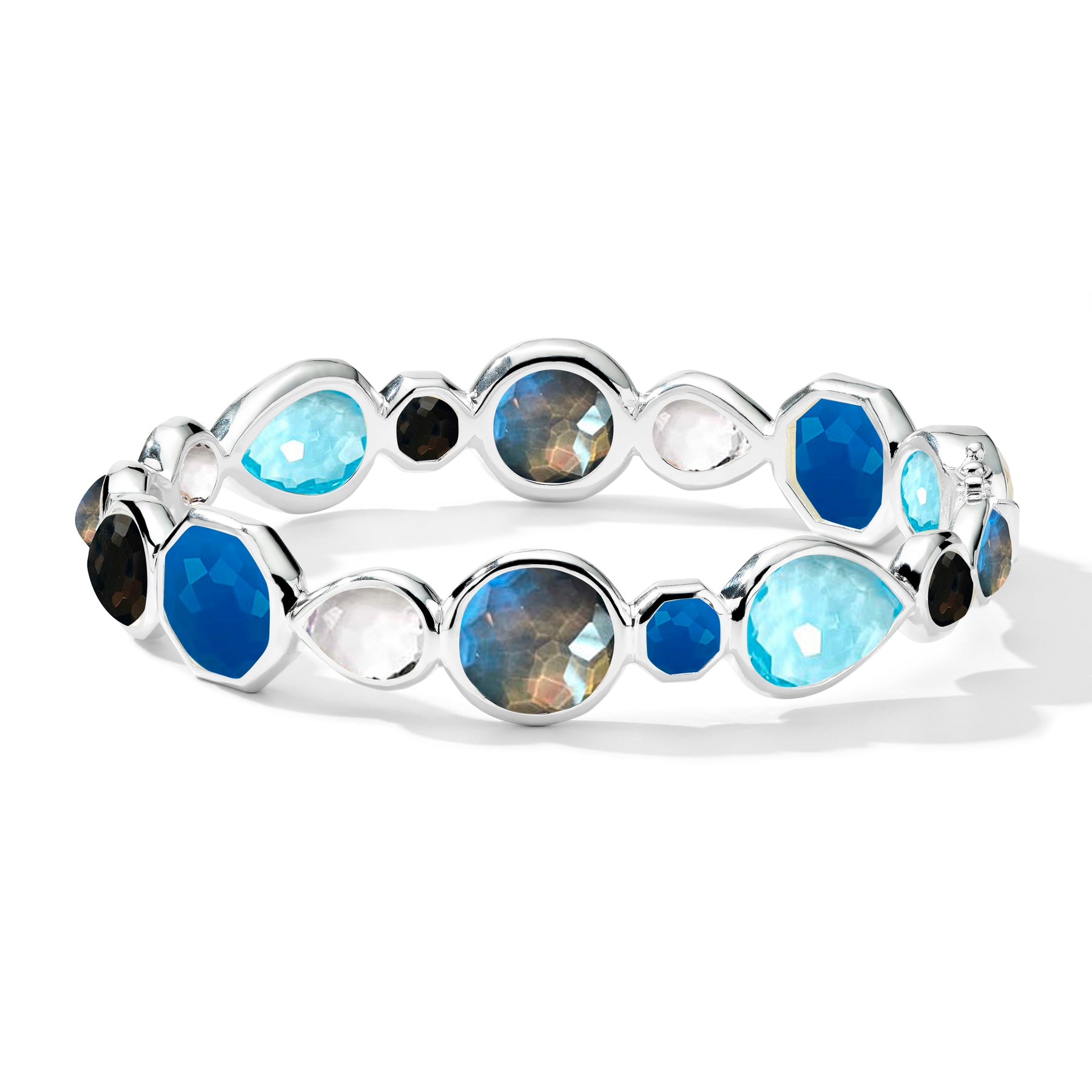 A perfect bracelet for anytime, all-occasion wear, this hinged style features rock crystal as well as doublets of rock crystal over black shell, rock crystal over mother-of-pearl and rock crystal over brown shell. The palette is inspired by the colors of sand and seashells against the clarity of clear waters — made all the more striking in mixed-shape bezels of 925 silver.